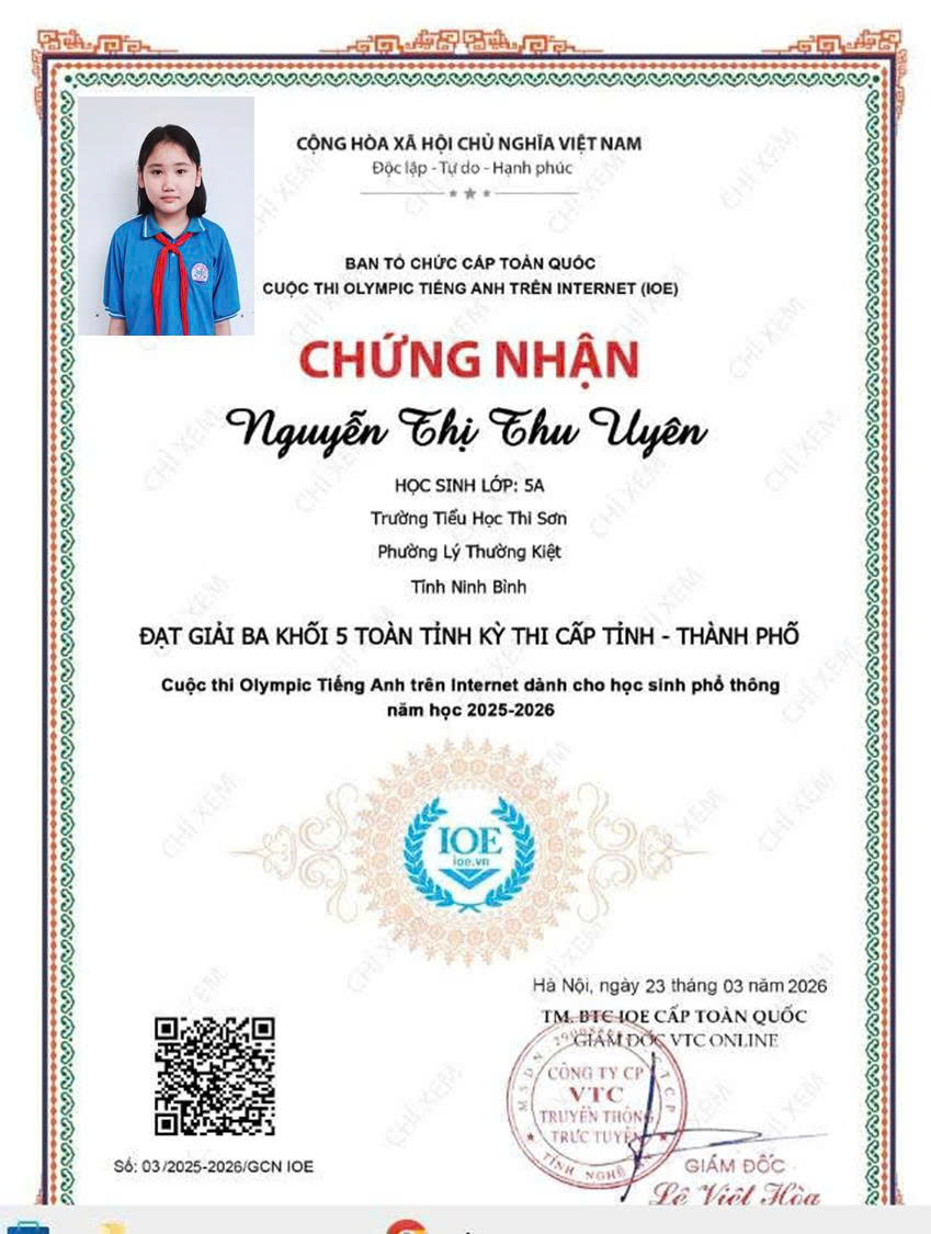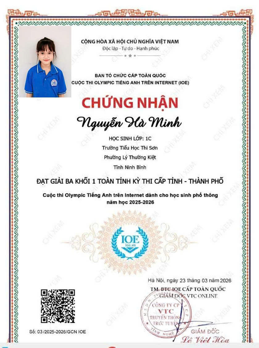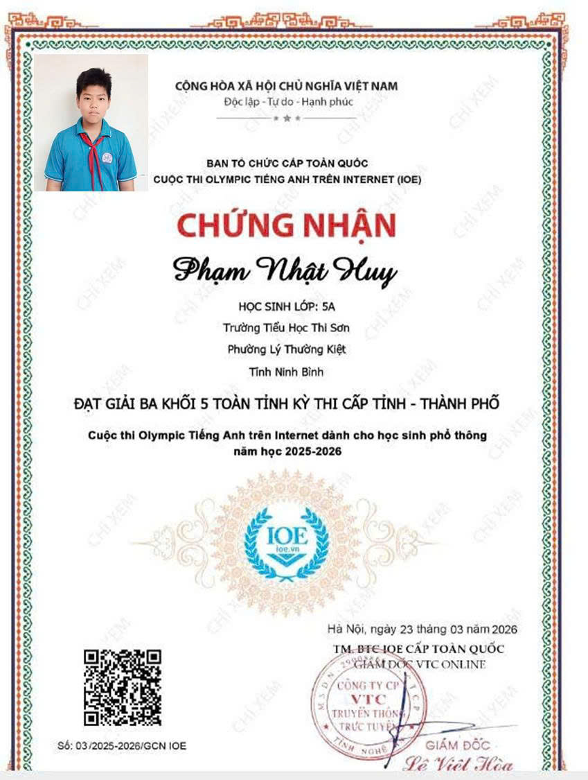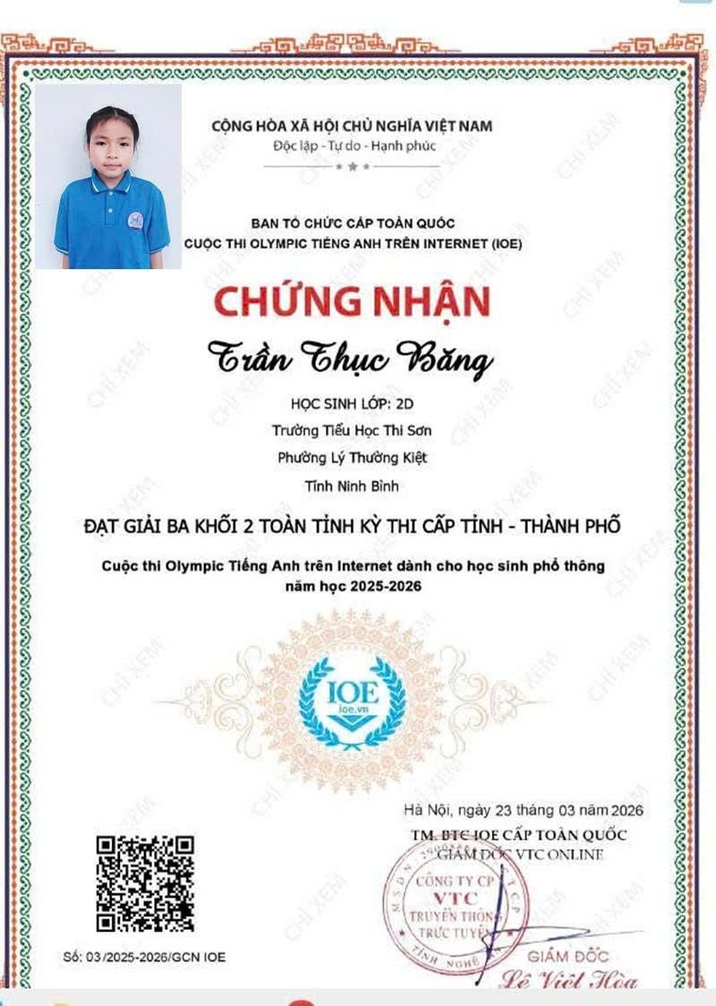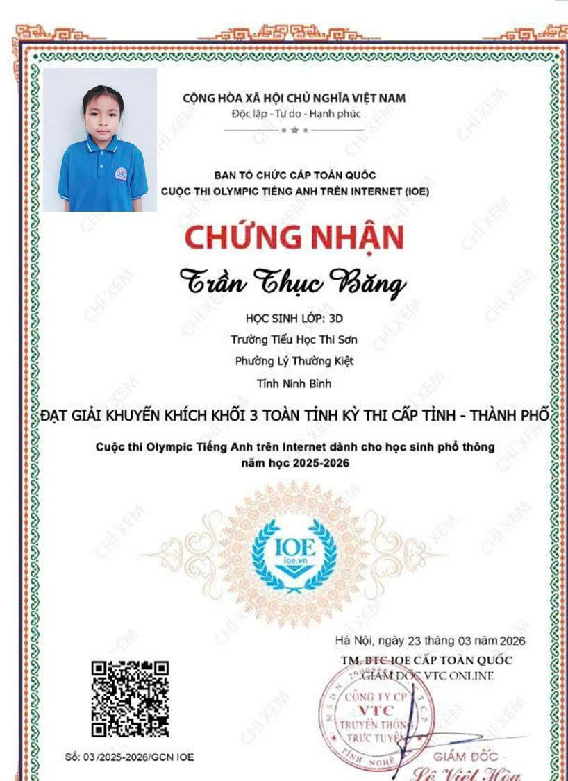 Trường Tiểu học Thi Sơn vinh danh học sinh có thành tích xuất sắc trong cuộc thi IOE cấp Tỉnh. Thành tích đạt được hôm nay là kết quả của sự nỗ lực bền bỉ của các em học sinh, sự tận tâm của thầy cô giáo và sự đồng hành, quan tâm của các bậc phụ huynh. Nhà trường tin tưởng rằng, trong thời gian tới, các em sẽ tiếp tục phát huy năng lực, chinh phục những sân chơi trí tuệ cao hơn.